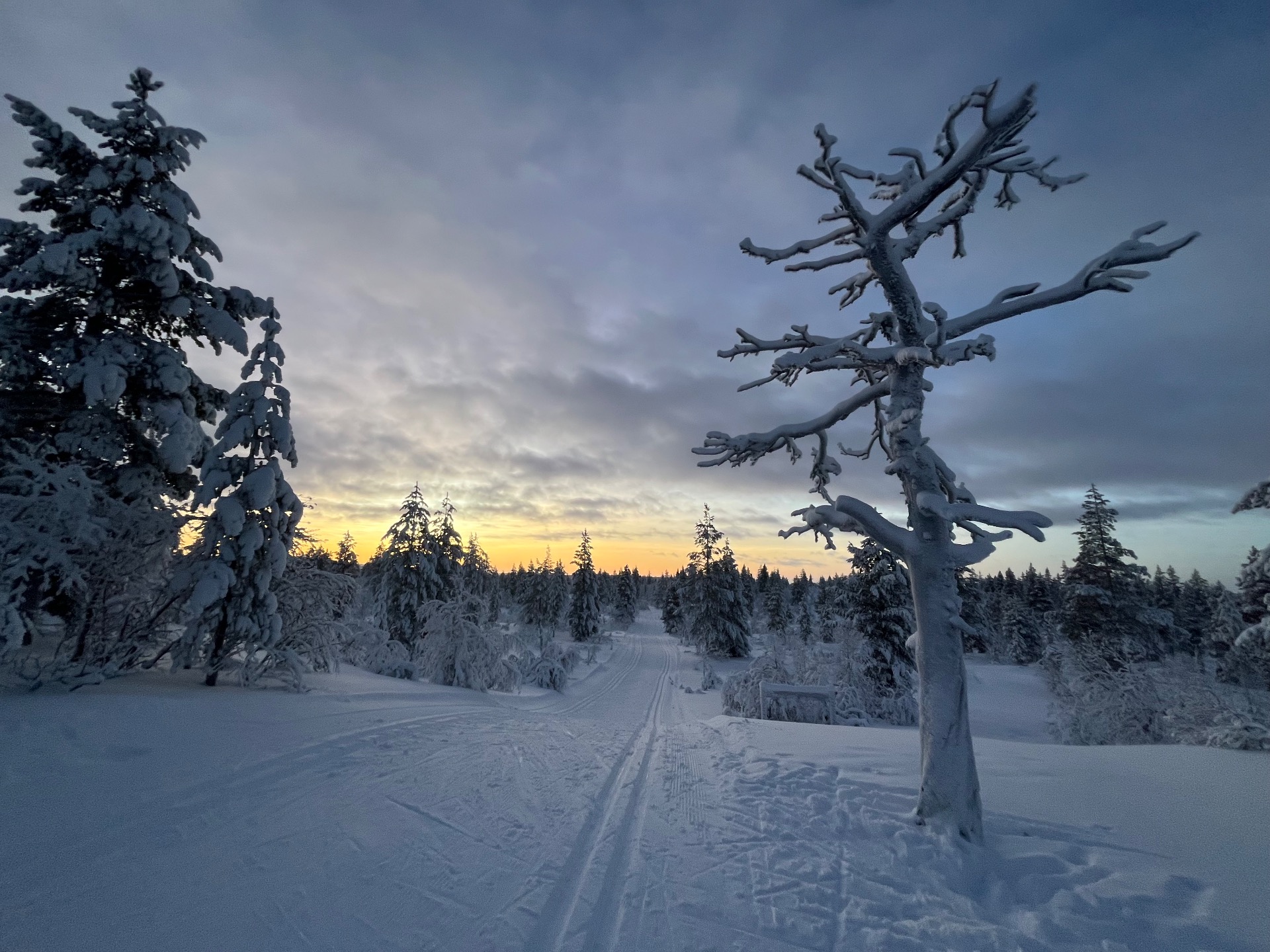 This excursion is for more experienced cross country skiers, who are comfortable on skis. We explore Urho Kekkonen National Park skiing tracks with a licensed skiing instructor, and enjoy a local sweet treat with steaming cup of coffee brewed the traditional way by the fire. To participate on this experience, one must have participated either to our XC ski lesson or other similar experience before.